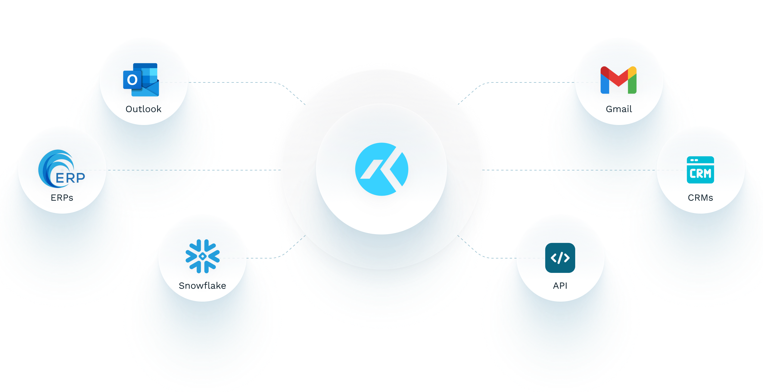 Connect quickly to the tools you already use: Outlook, Gmail, leading CRMs, ERPs, and data warehouses like Snowflake.